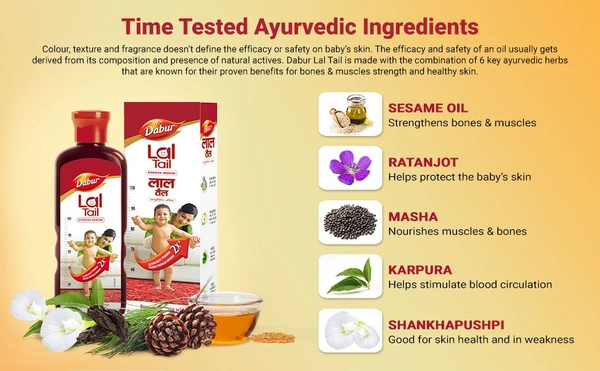 Dabur Lal Tail is a specially crafted Ayurvedic baby massage oil made with time tested ingredients that have many proven benefits for babies. It is clinically tested proven to give 2x faster physical growth*. It contains Ratyanjot which helps protect the baby’s skin, camphor which helps with blood circulation, Shankhpushpi which is good for skin health and in weakness, and Urad nourishes muscles and bones. Regular massage with Dabur Lal Tail also helps relieve colic and other digestive problems, improves sleep patterns of your little one, and stimulates blood circulation.